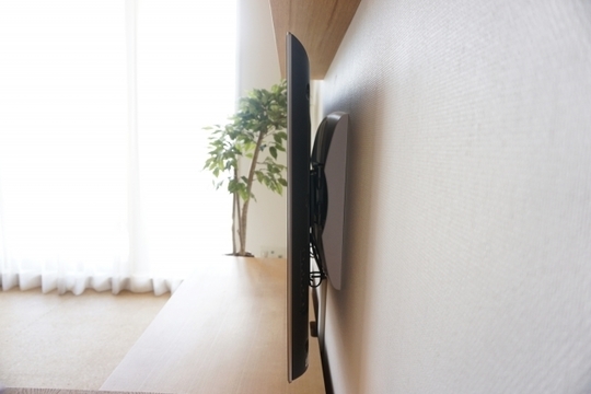 壁にぴったりと張り付いている壁掛けテレビ。動線の邪魔にらないので、ぶつかってしまったり、地震の際に倒れることもありません。また、従来の液晶テレビはテレビテーブル・テレビボードの下に埃がたまってしまうため掃除が大変でしたが、壁に直接設置すれば、わざわざテレビ下の掃除をする必要がありません。