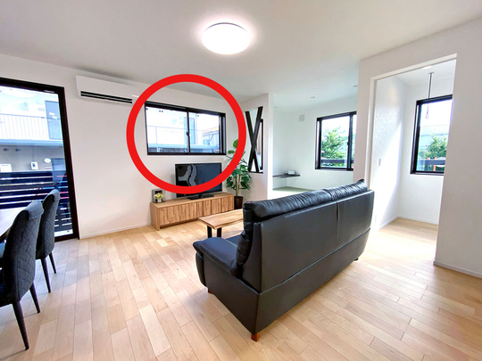 テレビ上に窓があり、光いっぱいの明るさ満点リビングでした。