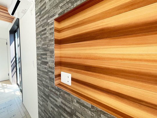 テレビを設置した時の線の出方や、操作がしやすいように壁の出方やコンセントの位置を調節してあります。