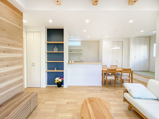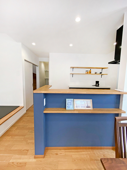オーク材のカウンターや棚、床とマッチした印象です。爽やかながらも、落ち着いた雰囲気にしてくれるネイビークロスは部屋の一角にあっても、きつくなりません。