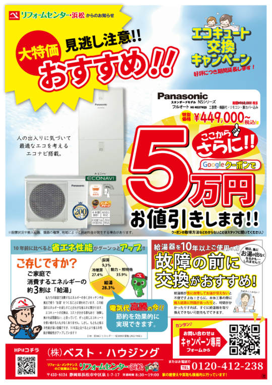 ぜひこのエコキュート交換キャンペーンの機会をお見逃しなく('ω')ノ少しでも気になった方、もっと知りたいと思った方、リフォームセンター・浜松にお任せください!どんな小さなご相談でもお待ちしております♪
