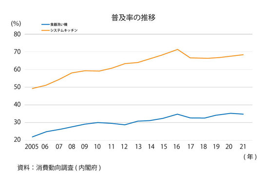 なお、キッチン関係の設備については、システムキッチンの普及も進んでいますが、食器洗い機とシステムキッチンの普及率の推移は似たような傾向を示しています。