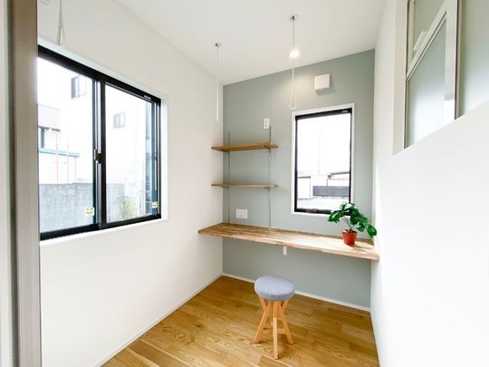 テレワークスペースを新たに設置するために、室内空間の一角に、単独では自立せず、当該住宅に固定することで自立する机等を新たに設置する工事。