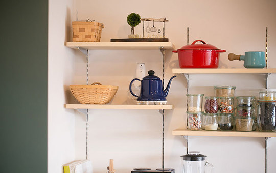 そして、選んだ調理器具や小物を配置・収納していきます。この時、配置や収納の仕方によっては生活感が出てしまうと雰囲気が台無しになるので、調理器具は綺麗に見えるように小物と上手く合わせて配置するのがポイントです。