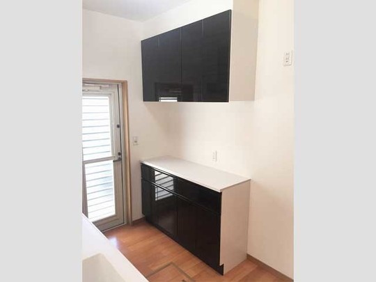 一方でこちらは、白と黒の2色でまとめています。リフォーム前と比べてみると、シックでとても落ち着いた雰囲気に一変しましたね。さらにこちらのキッチンは、対面式キッチンなので、上手く使えばお店のカウンターのような雰囲気を醸し出すこともできますね。