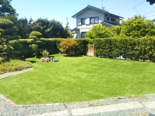 玄関前の広いお庭を人工芝にリフォームしたことで、歩きやすく、メンテナンスはほぼ不要。見た目も鮮やかで美しい仕上がりになりました。