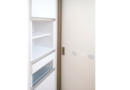 マンションのリフォームをしました。開き戸で引き出しとぶつかってしまう部分を引き戸にしました。埋め込み収納棚も新しくつけました。