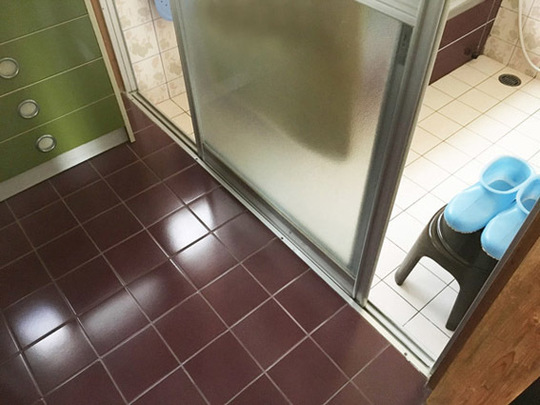 出入り口扉は少し段差があり、脱衣所のタイルは冬にはとても冷たくなってしまいますね。