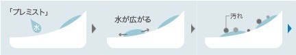 「セフィオンテクト」は水になじみやすい性質(親水性)があるので、「プレミスト」が「セフィオンテクト」につくと水が表面に広がり汚れを付着しにくくします。