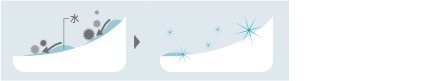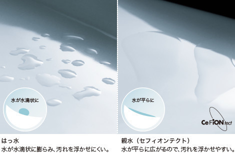 乾いた表面に汚れが付着すると、水を流しても汚れが落ちにくい。「セフィオンテクト」は親水性が高く、水になじみやすいので、汚れもすっと流れやすくします。