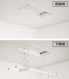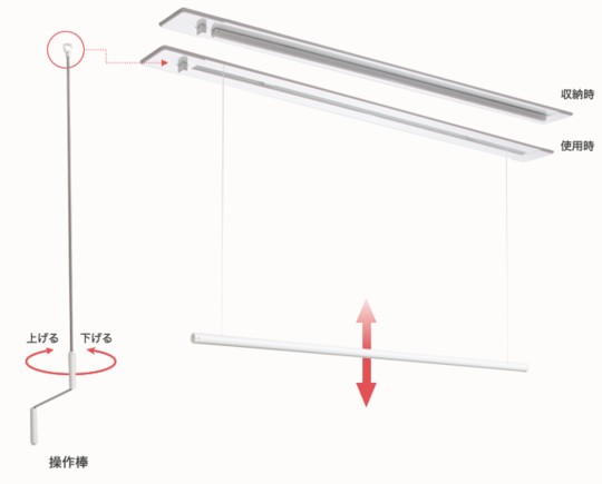 竿を昇降させることで、洗濯物をお好みの位置で干すことができます。昇降は操作棒をくるくる回すだけ。使わないときは操作棒を取外してすっきりと収納することができます。竿が最大で1m降ろせるので、無理のない高さで掛けた後は、邪魔にならない天井近くまで上げておくことができます。