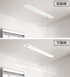 こちらは紐で昇降させるタイプ。こちらもお好みの高さで調整ができるので、干してから上げる事も出来ます。