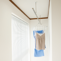今は、はじめから付いている家も多くなってきました。そして天気に影響されることもなく、花粉やほこりも付かないので後から付ける家も多くなってきています。(花粉症対策にもなるんですね)洗濯物を重ねずにしっかりとしたスペース干せるので「いやーな匂い」も気にならない!