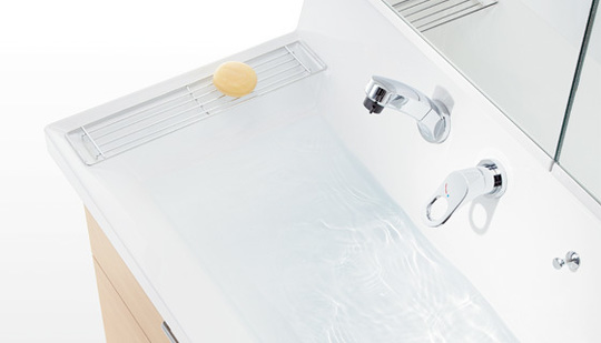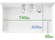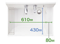 スクエアなアウトラインにやわらかなカーブを組み合わせることで、実際のサイズよりもワンサイズ上のボウル広さを実現。使いやすさもワンランク上の洗面器です。