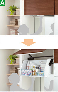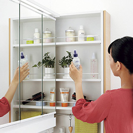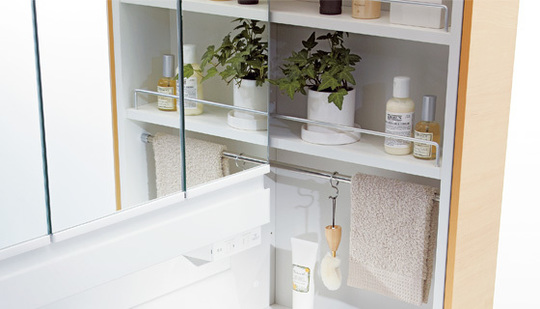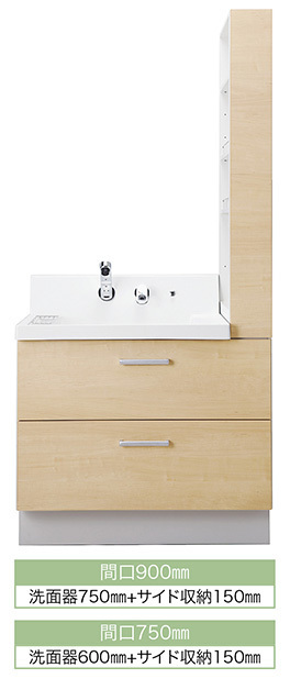 幅150mmの取り出しやすいオープンタイプのサイド収納がついた化粧台本体をラインアップ。同じ間口で収納量がグンとアップ。お求めやすい価格でワンランク上の便利を実現。