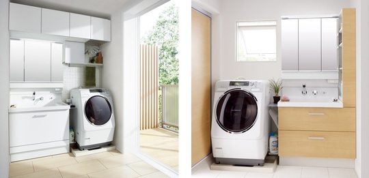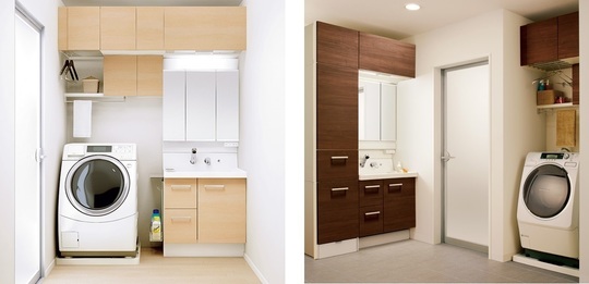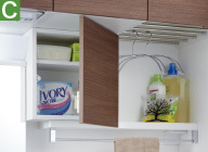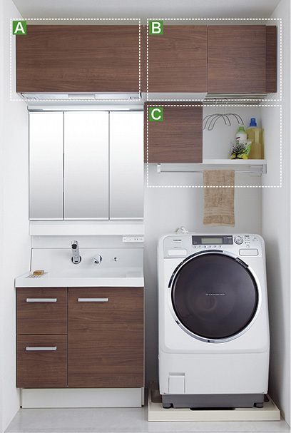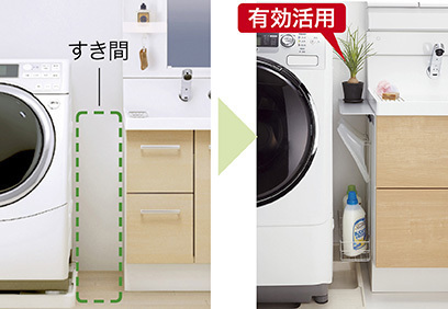 洗濯機との間に空きがちなムダなすき間。155mm以上の幅があれば、スキマ収納で有効活用できます。