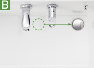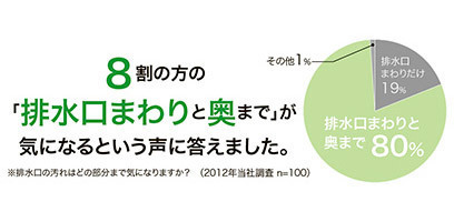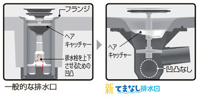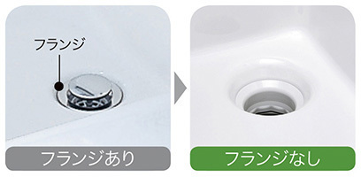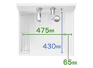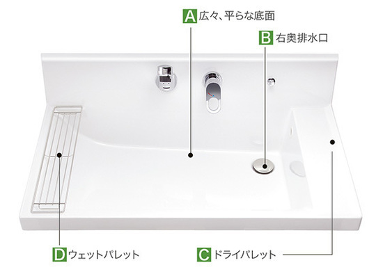 排水口を作業の邪魔にならない右奥に配置。洗面器の広さを最大限に生かします。