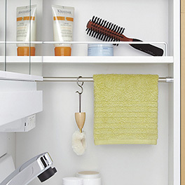 底板で間口調整。底板にはタオル掛けもついて空間の無駄をなくします。