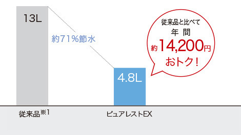 1回あたり13L必要だった15年前の便器と比べて、大幅な節水を実現しました。毎日普通に使っているだけで、いつの間にか大きな節約効果があります。