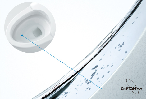 乾いた表面に汚物が付着すると、水を流しても汚れが落ちにくい。セフィオンテクトは親水性が高く、水になじみやすいので、汚物をすっと流れやすくします。