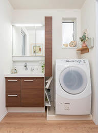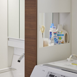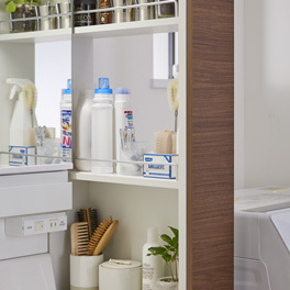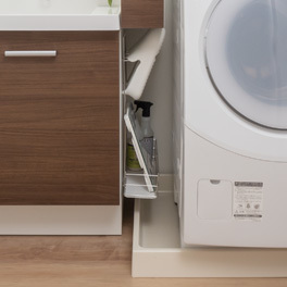 デッドスペースになりがちな洗濯機とのすき間を、洗面用品や洗剤などの収納スペースにできます。