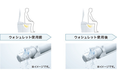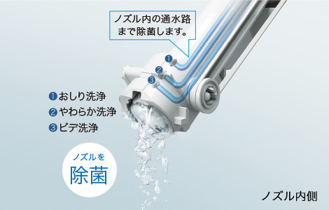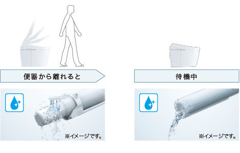 「ウォシュレット」使用前後に水でノズルを洗浄する。「セルフクリーニング」に加え、トイレ使用後に「きれい除菌水」が、のずるの内側も外側も自動で洗浄・除菌。使用していないときにも定期的に洗浄することで、ノズルのきれいが長持ちします。