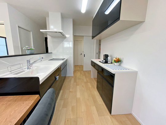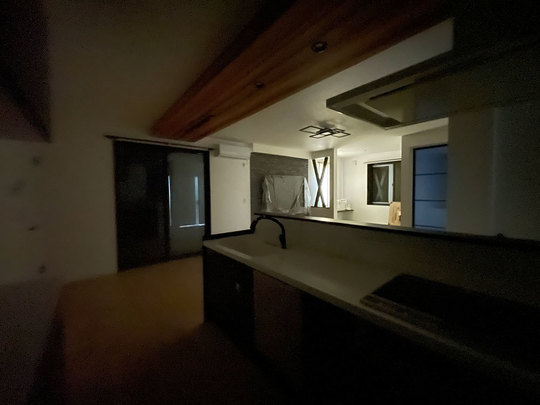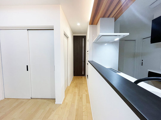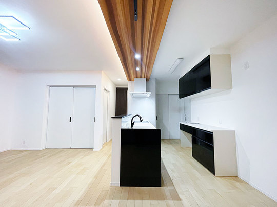 ブラックチェリー木目柄の折り下げ天井がキッチンからダイニングにかけて伸びている格好は圧巻です。