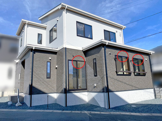赤い部分に電動シャッターを取り付けます。1階の大きな窓4カ所+2階の寝室です。