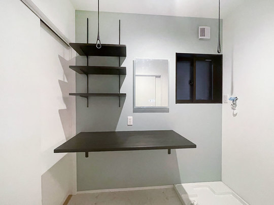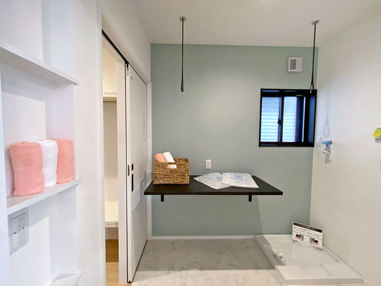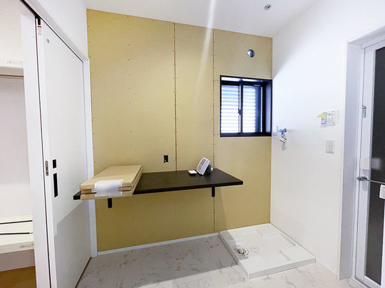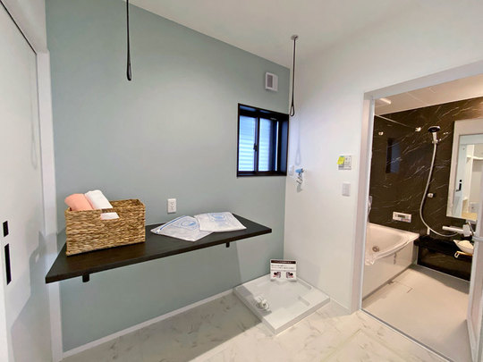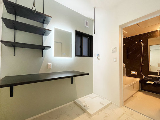 バスルームに抜ける室内干しに使えるランドリー・脱衣所。