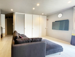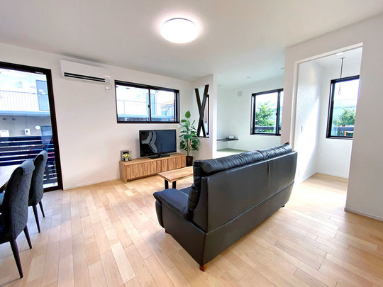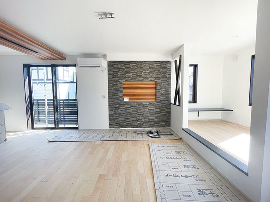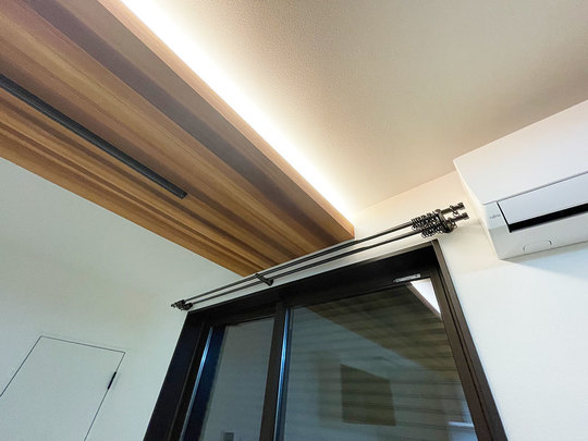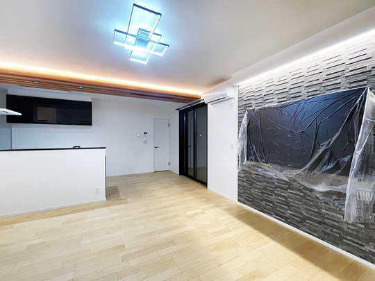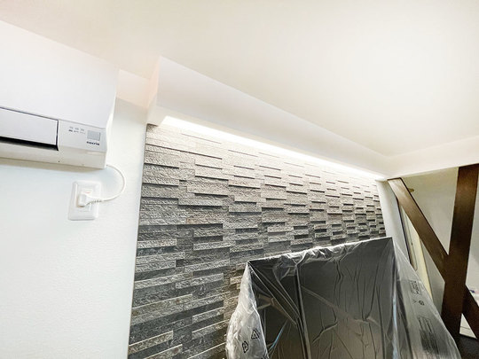 窓を塞いだ壁には、テレビを固定できるように下地を入れて、エコカラットの壁になりました。さらに垂れ壁内に間接照明で雰囲気を演出できています。
