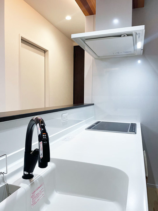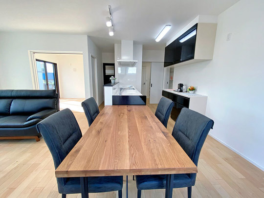 Ⅰラインのキッチンとダイニングの並びです。天井に注目すると、スポットライトがあります。