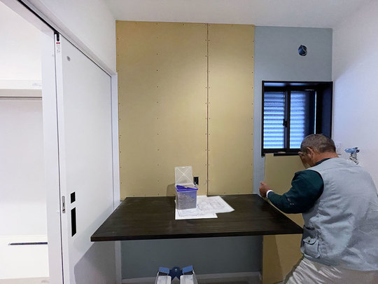 窓枠・換気扇の穴・元々のカウンターの位置など計算しながら、ピッタリに!!
