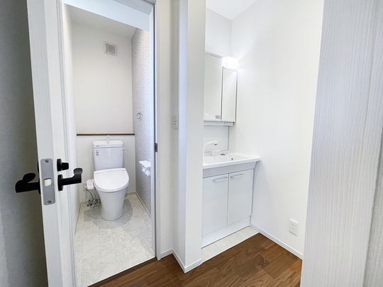 廊下に洗面の出っ張りがなく、スッキリ納まっています。