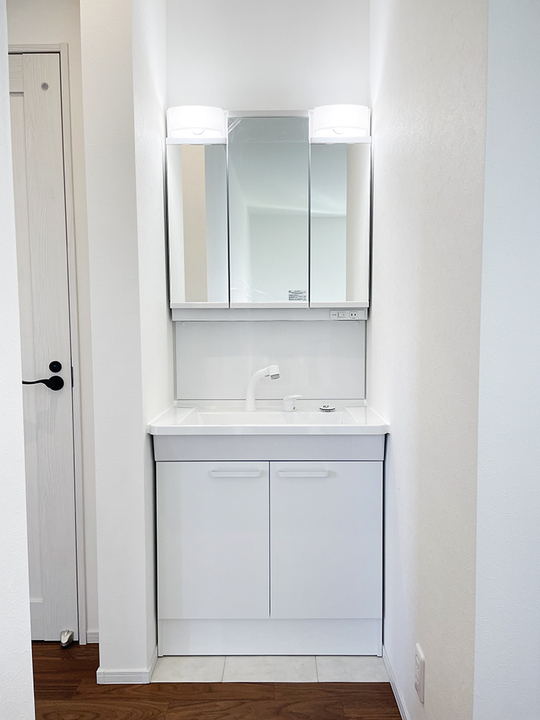 クローゼット奥行きサイズとの洗面台横幅900サイズとピッタリだったので納まりがいいですね。【TOTO】