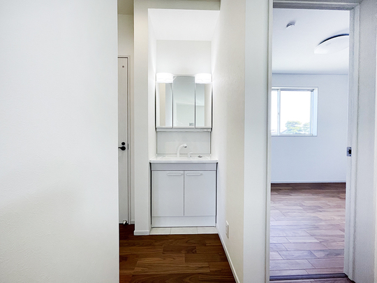 背面にあたるクローゼットをつぶすことで、洗面化粧台が通路の邪魔にならないようになりました。
