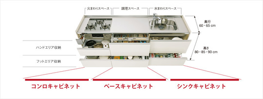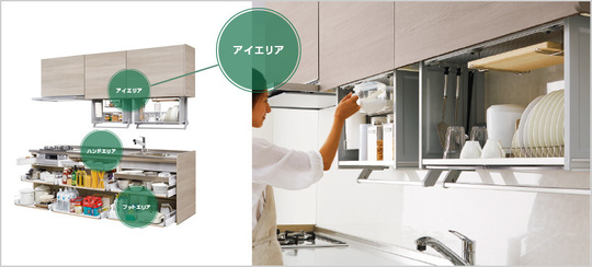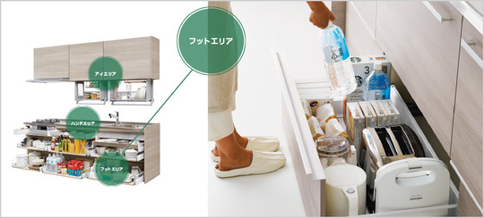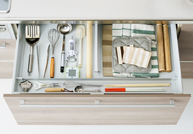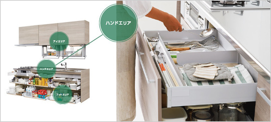 必要なものをサッと取り出せる、一歩進んだハンドエリア収納。調理小物・カトラリー・調味料ボトルなど使用頻度の高いものを楽に取り出せます。