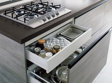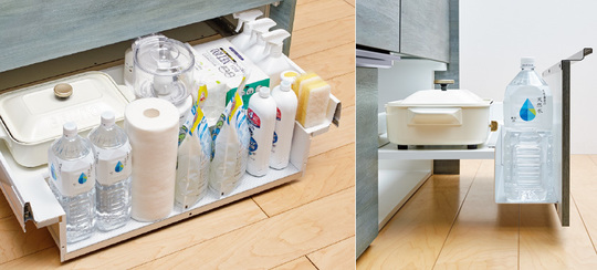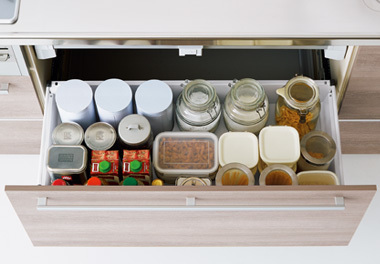 扉と連動して引き出されます。調理の作業中によく使う道具や小物などを収納できます。