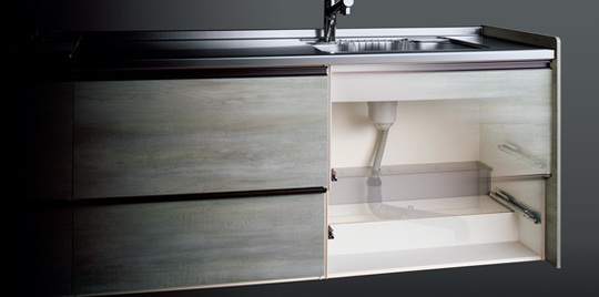 既存の配管を再利用することが多いリフォーム。キッチン内に広い配管が必要なため、開き戸タイプに制限されたり、引き出しが小さくなる場合が多々ありました。リフォーム配管対応シンクキャビネットなら内部に配管用の大きなスペースがあり、既設配管や横引配管など、さまざまな制約に対応可能です。