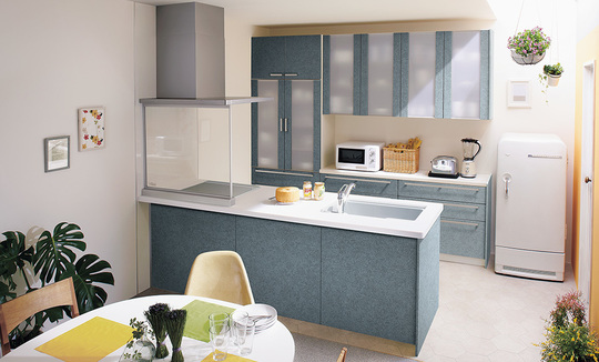織物調の扉が心地よいキッチン。人工大理石はブルーグレーをセレクト。奥行き80㎝タイプなら、小さなスペースでも憧れの対面型キッチンが実現できます。