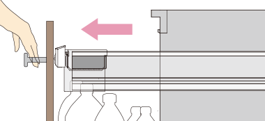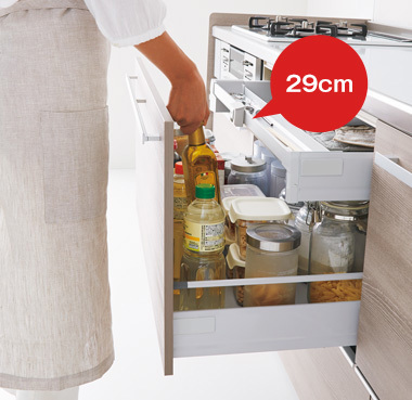 背の高い油や調味料ボトルなどを、引き出しの手前にたっぷり収納でき、楽に取り出せます。