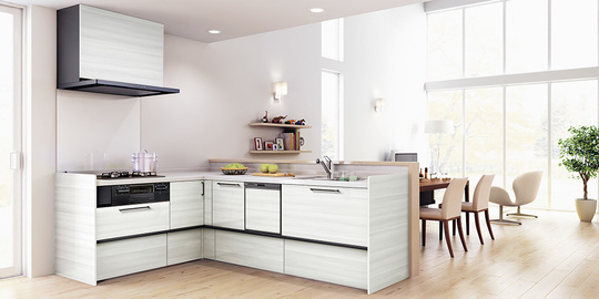 作業がしやすいL型だから2人での料理もゆったり広々と行えます。上品な木目のグラセウッドホワイトに人工大理石のワークトップ。素材感にこだわったLDKを演出します。