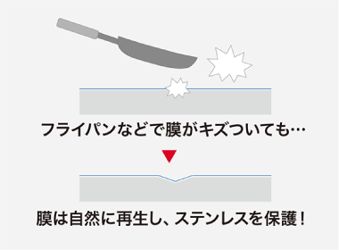ステンレスはそもそも、鉄にクロムなどの金属を混ぜ合わせた合金です。鉄だけでは腐食してしまいますが、ステンレスに含まれているクロムが空気中の酸素と結びついて「不動態被膜」というバリヤーをつくります。これによって塗装などをしなくてもサビにくい強い金属になるのです。さらに「不動態被膜」は表面が傷ついても自然に再生するのでステンレスは耐久性が高い素材として評価されています。