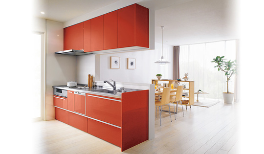 空間を明るくするアコードレッドのキッチンには収納力を確保できる吊戸棚とカップボード、食器洗い乾燥機を搭載。活動的で忙しいご家族には、高機能はもちろん、毎日が楽しくなるキッチンがおススメです。
