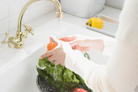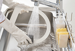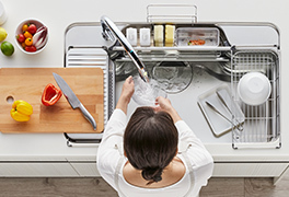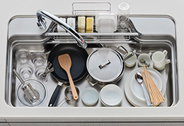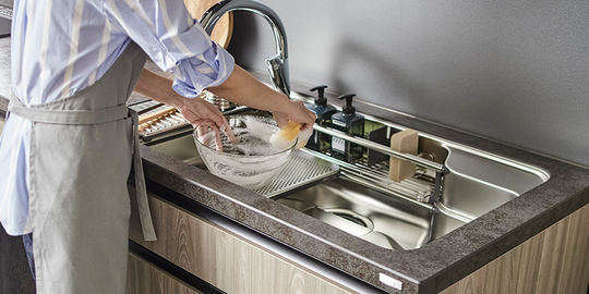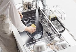 下ごしらえ中のちょっとした洗い物。差し出すだけで早く洗えるから、調理のリズムを崩しません。