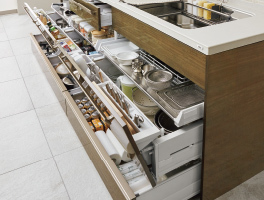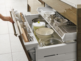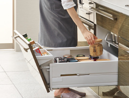 テコの原理を応用し、引出しが軽い力で開きます。中はよく使うものほど取り出しやすい立体構造に。