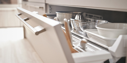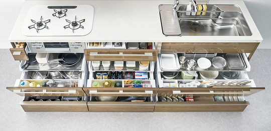 奥行きいっぱいまで収納できるロングスライド引出しで収納量もたっぷり確保。奥にしまったものもスムーズに取り出せます。