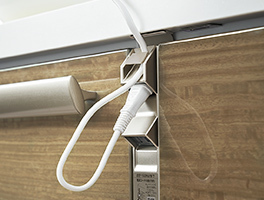 出したままになりがちな調味料などの小物を「ハンディボックス」にまとめて収納。便利なコンセント付きです。