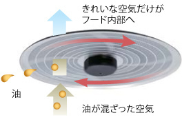 温度センサーが調理状況に応じて自動で風量を調節。油煙の広がりを抑えて、省エネ運転も実現します。