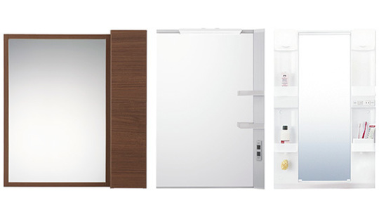 インテリア性の高い木枠1面鏡や大型ミラーの1面鏡、収納付きの1面鏡など使い勝手に合わせて選べる計5種類のミラーをご用意しています。