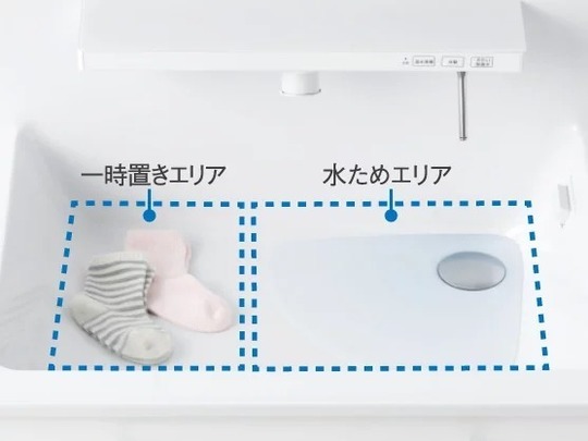 厚手のセーターもしっかり洗えるボウル。洗い物が多いときは「一時置きエリア」に置いて、「水ためエリア」で水を浸けて洗うなど、使い分けられて便利です。